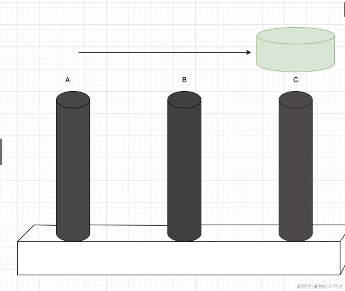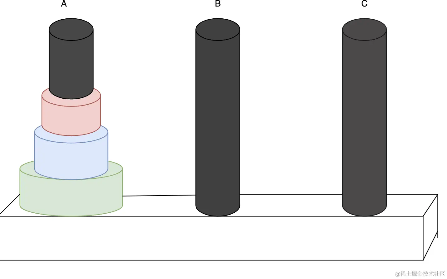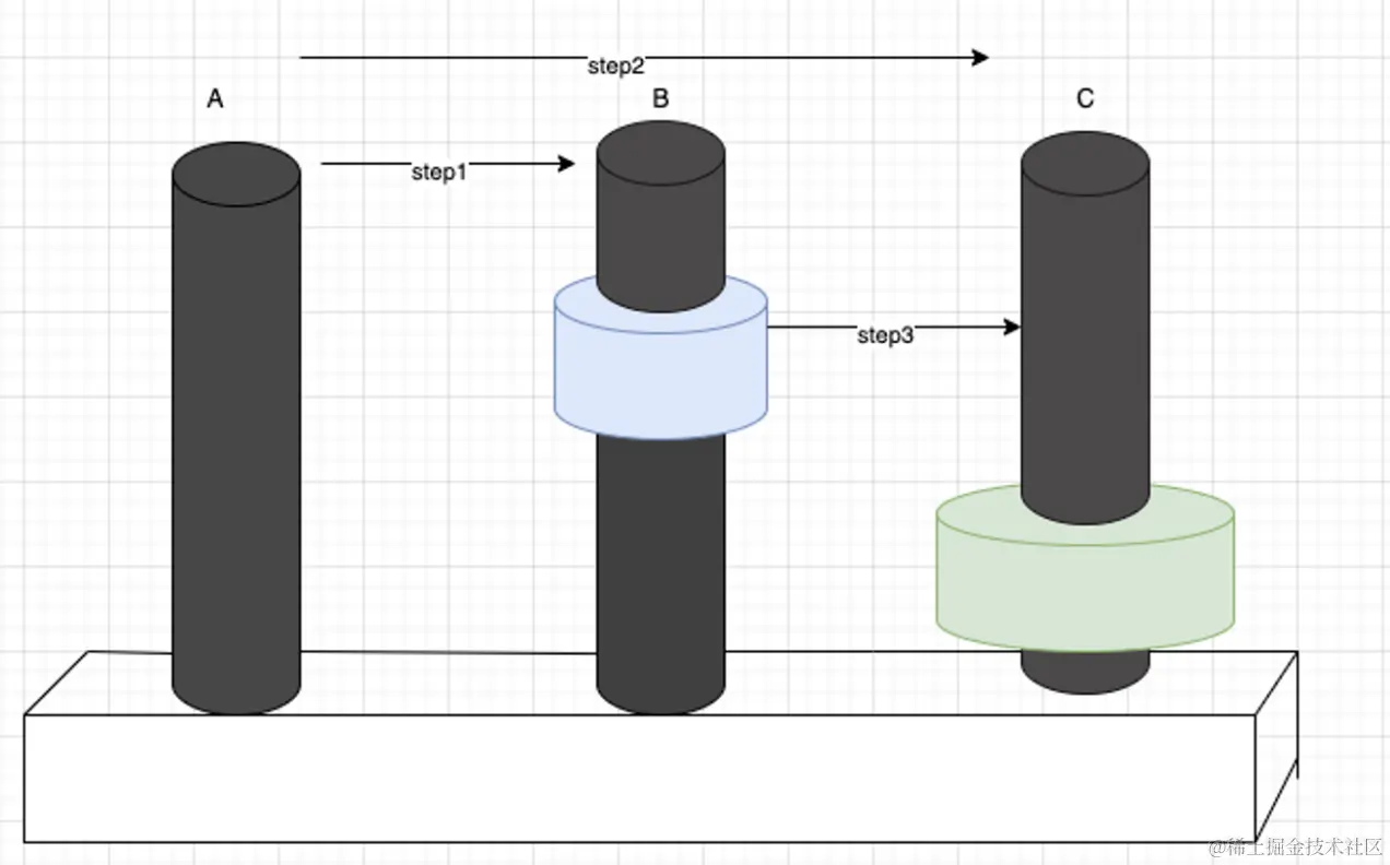- 然后把最后一个盘子直接从起始柱A移动到目标柱C。