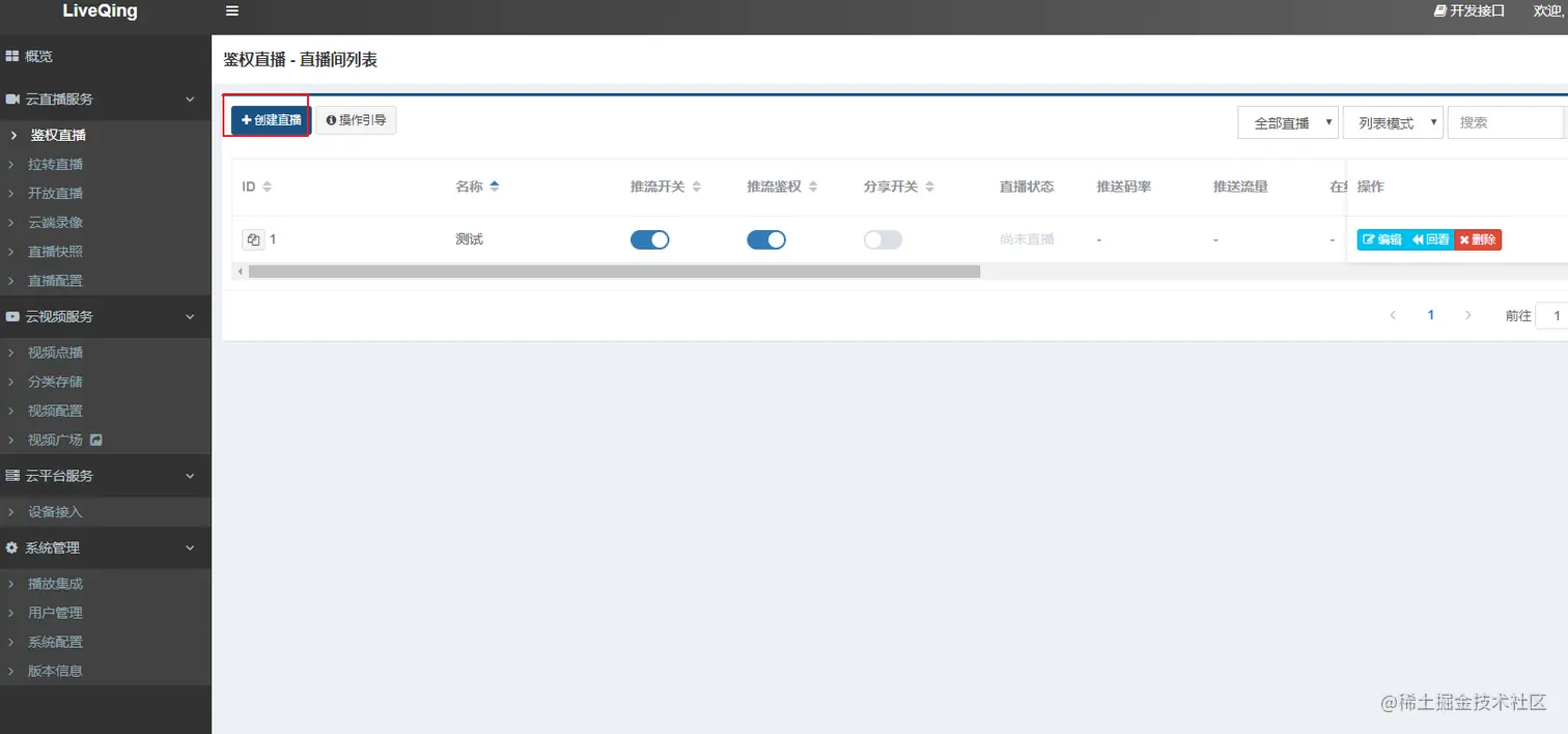 - 为了测试可以本地下载一个OBS软件推流到该地址,只要一推流,直播状态就会显示直播中并且点击编辑可以获取拉流的地址。