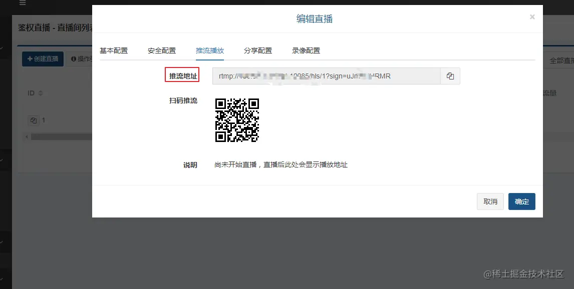 - 创建一个直播,设置名称和ID,然后选择编辑获取推流地址。