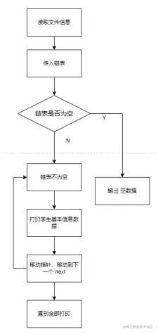 先读取文件数据,如果文件有数据会存入 head 中,之后判读链表是否有数据,没有则打印空数据,有数据就遍历链表,循环打印每个节点的数据,并向后移动指针,直到全部打印完毕。