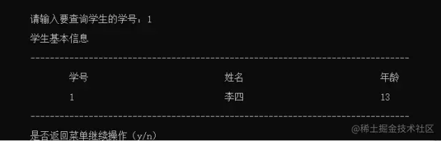在菜单输入 1,进入学生信息录入,依次输入学号,姓名,年龄,回车就能保存。具体流程为创建一个链表,判断头节点是否为空,为空就重新创建,申请新的节点空间,将 next 设置为 NULL,有了链表,一直循环到链表最后,也就是 next 为 NULL,接着申请一个节点存放学生信息,然后连接起来。