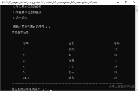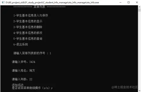 菜单页面可以选择不同的学生基本信息操作,下图分别是数据读取,菜单界面,学生的添加,文件保存以及学生数据的展示。