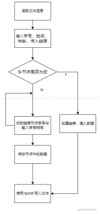 读取文件数据,输入学号,姓名,年龄,传入链表,判断链表是否存在,不存在则创建新链表,存在就找到节点学号数据与输入学号相同的节点,修改节点中的数据,保存到文件中。