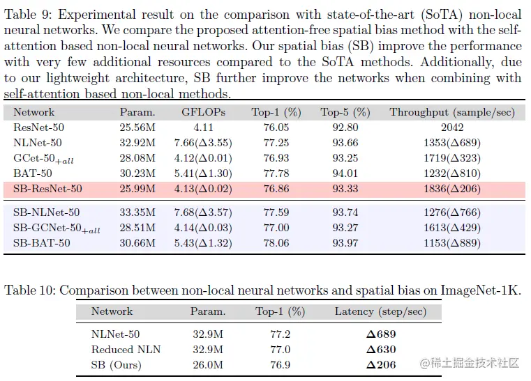 - 相比于NLNet,空间偏置需要较少的参数开销,因此比它们快3.3倍。