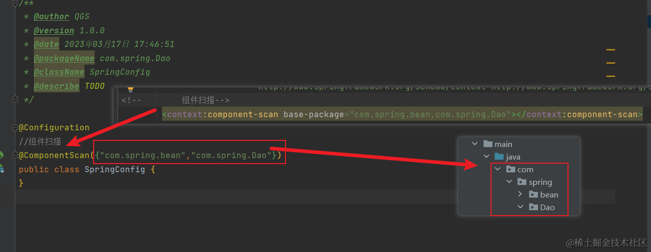@ComponentScan({"com.spring.bean","com.spring.Dao"})
