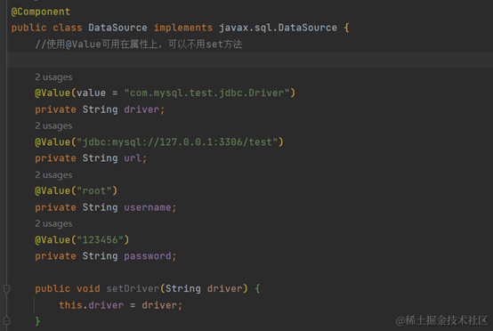 //当属性是简单数据类型的时候,可以使用@Value注解进行注入