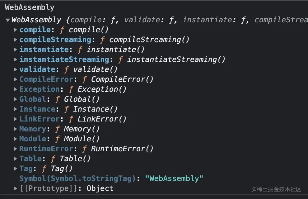 在浏览器控制台中,直接打印就可以看到WebAssembly构造函数。