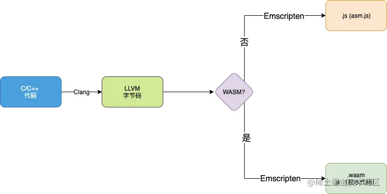 C/C++代码通过Clang编译为LLVM字节码,然后根据不同的目标编译为asm.js或wasm。