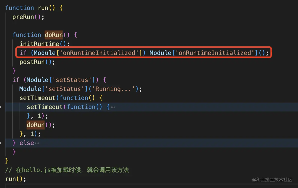 基本思路就是在Module初始化前,向Module中注入一个名为onRuntimeInitialized的方法,当Emscripten的运行时准备就绪时,将会回调该方法。