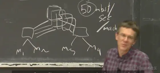 Robert教授:随着Google这些年对MapReduce系统的改进,答案也略有不同。通常情况下,如果我们在一个例如GFS的文件系统中存储大的文件,你的数据分散在大量服务器之上,你需要通过网络与这些服务器通信以获取你的数据。在这种情况下,这个箭头表示MapReduce的worker需要通过网络与存储了输入文件的GFS服务器通信,并通过网络将数据读取到MapReduce的worker节点,进而将数据传递给Map函数。这是最常见的情况。并且这是MapReduce论文中介绍的工作方式。但是如果你这么做了,这里就有很多网络通信。 如果数据总共是10TB,那么相应的就需要在数据中心网络上移动10TB的数据。而数据中心网络通常是GB级别的带宽,所以移动10TB的数据需要大量的时间。在论文发表的2004年,MapReduce系统最大的限制瓶颈是网络吞吐。如果你读到了论文的评估部分,你会发现,当时运行在一个有数千台机器的网络上,每台计算机都接入到一个机架,机架上有以太网交换机,机架之间通过root交换机连接(最上面那个交换机)。