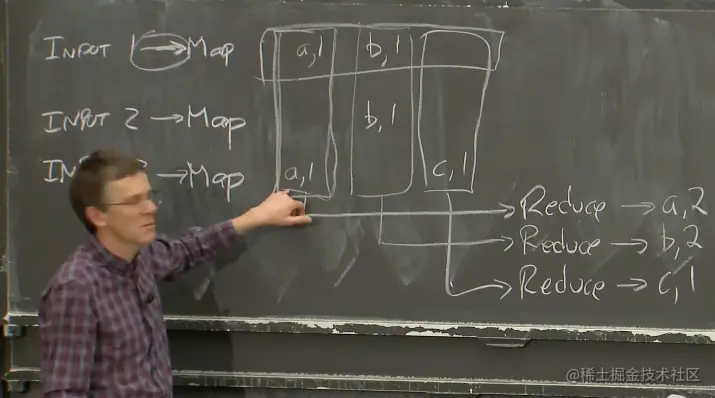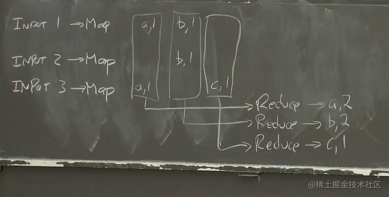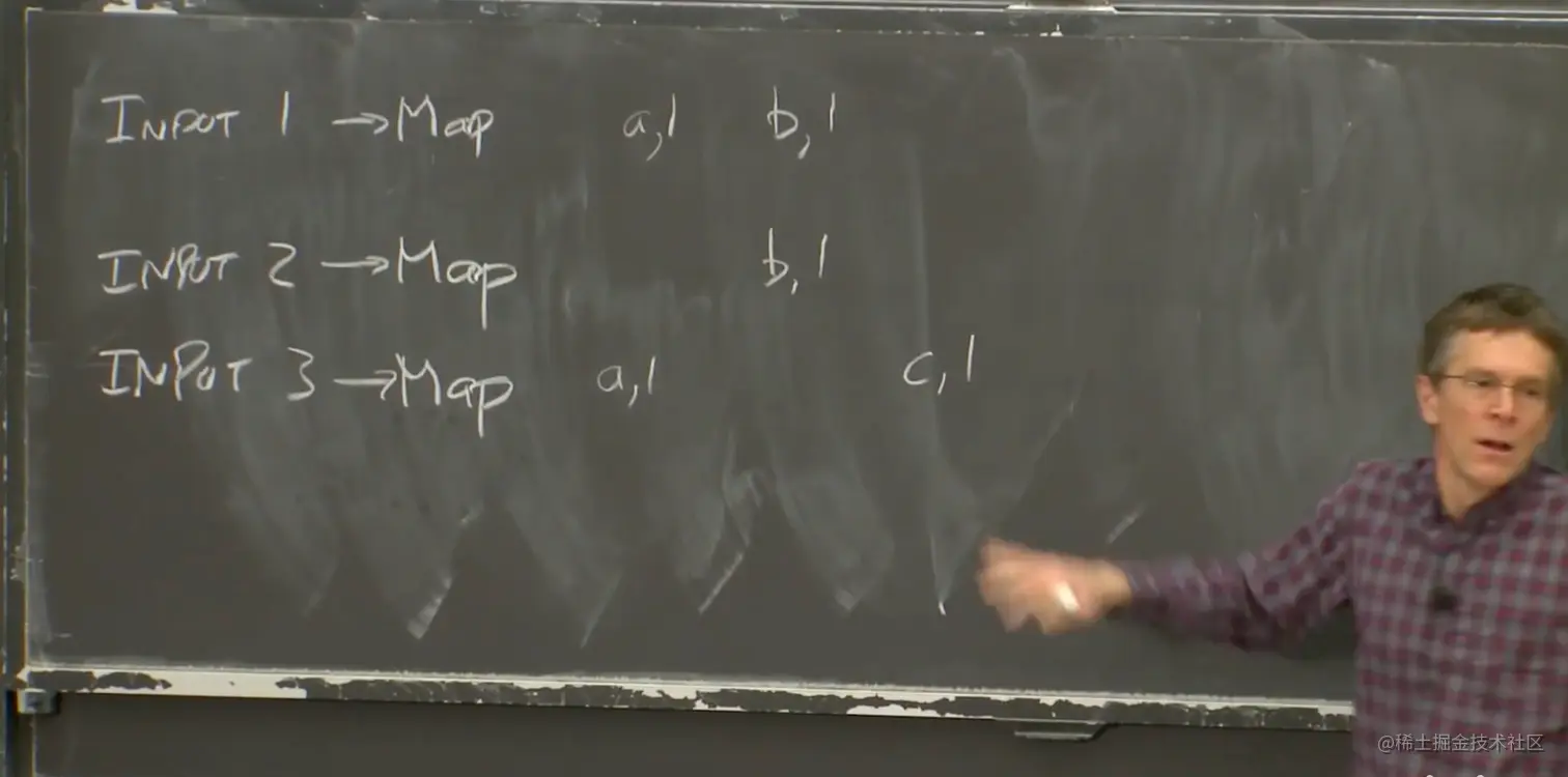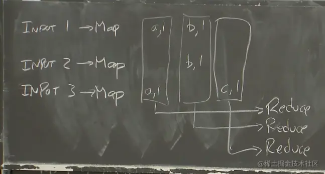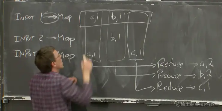 Map函数以文件作为输入,文件又是整个输入数据的一部分。Map函数的输出是一个key-value对的列表。假设我们在实现一个最简单的MapReduce Job:单词计数器。它会统计每个单词出现的次数。在这个例子中,Map函数会输出key-value对,其中key是单词,而value是1。Map函数会将输入中的每个单词拆分,并输出一个key-value对,key是该单词,value是1。最后需要对所有的key-value进行计数,以获得最终的输出。所以,假设输入文件1包含了单词a和单词b,Map函数的输出将会是key=a,value=1和key=b,value=1。第二个Map函数只从输入文件2看到了b,那么输出将会是key=b,value=1。第三个输入文件有一个a和一个c。