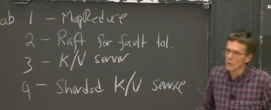 有四次编程实验。第一次实验需要在下周五前完成,这是一个简单的MapReduce实验。你们要根据你们在论文中读到的来实现你们版本的MapReduce。我们过一会就会讨论这个论文。第二个实验实现Raft算法,这是一个理论上通过复制来让系统容错的算法,具体是通过复制和出现故障时自动切换来实现。第三个实验,你需要使用你的Raft算法实现来建立一个可以容错的KV服务。第四个实验,你需要把你写的KV服务器分发到一系列的独立集群中,这样你会切分你的KV服务,并通过运行这些独立的副本集群进行加速。同时,你也要负责将不同的数据块在不同的服务器之间搬迁,并确保数据完整。这里我们通常称之为分片式KV服务。分片是指我们将数据在多个服务器上做了分区,来实现并行的加速。