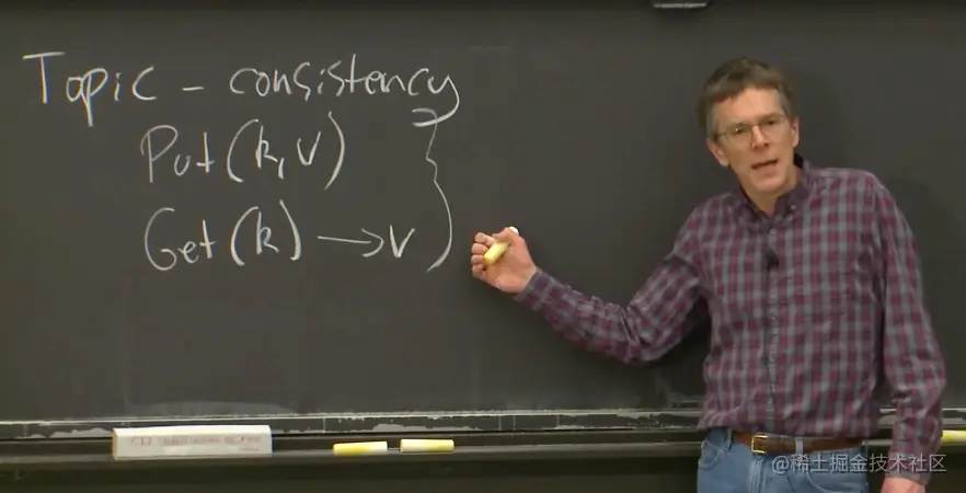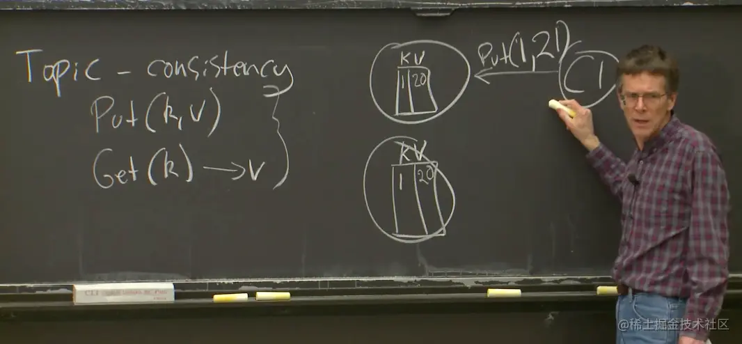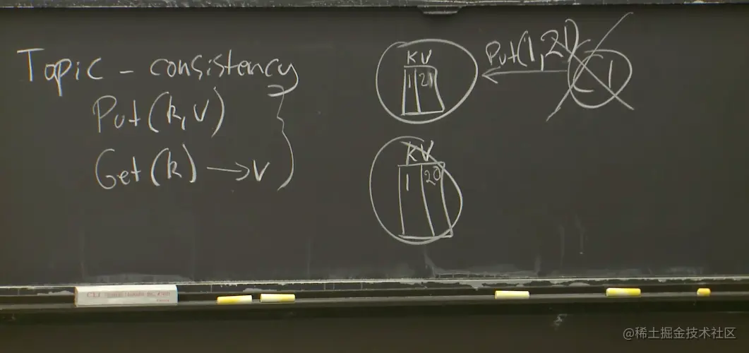 要理解一致性,这里有个例子,假设我们在构建一个分布式存储系统,并且这是一个KV服务。这个KV服务只支持两种操作,其中一个是put操作会将一个value存入一个key;另一个是get操作会取出key对应的value。整体表现就像是一个大的key-value表单。当我需要对一个分布式系统举例时,我总是会想到KV服务,因为它们也很基础,可以算是某种基础简单版本的存储系统。