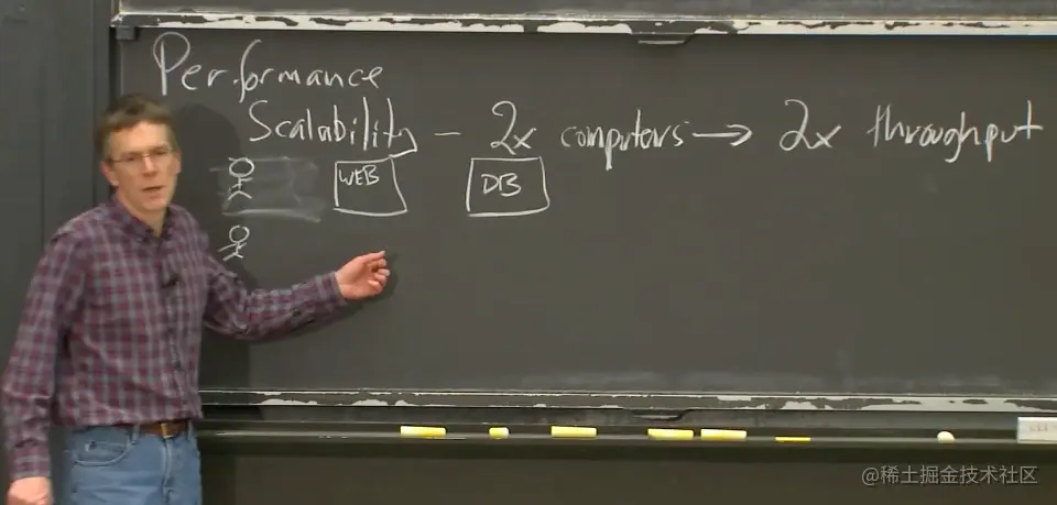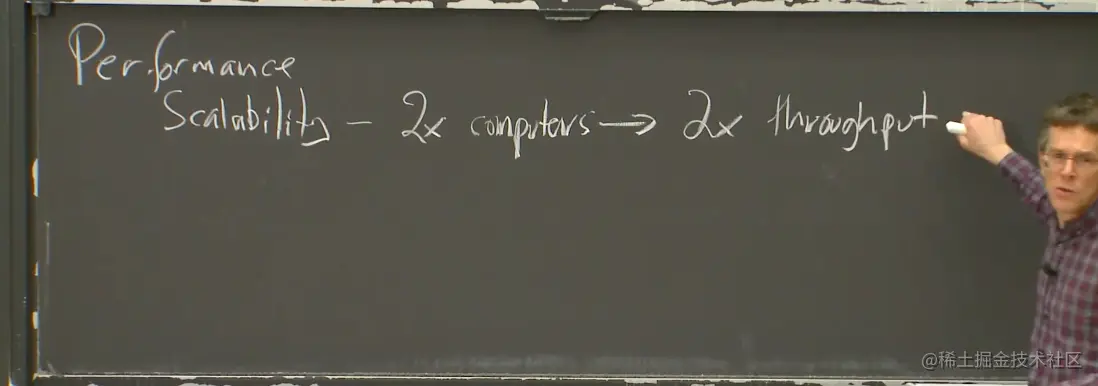 通常来说,构建分布式系统的目的是为了获取人们常常提到的可扩展的加速。所以,我们这里追求的是可扩展性(Scalability)。而我这里说的可扩展或者可扩展性指的是,如果我用一台计算机解决了一些问题,当我买了第二台计算机,我只需要一半的时间就可以解决这些问题,或者说每分钟可以解决两倍数量的问题。两台计算机构成的系统如果有两倍性能或者吞吐,就是我说的可扩展性。