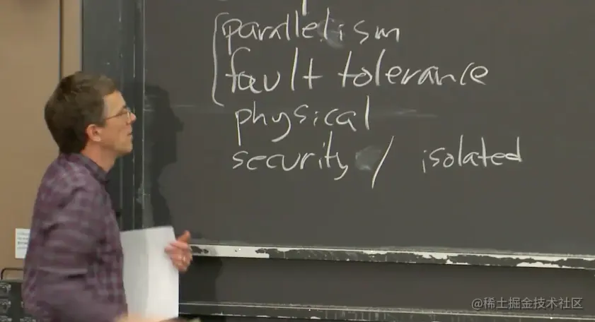 - 最后一个原因是,人们构建分布式系统来达成一些安全的目标。比如有一些代码并不被信任,但是你又需要和它进行交互,这些代码不会立即表现的恶意或者出现bug。你不会想要信任这些代码,所以你或许想要将代码分散在多处运行,这样你的代码在另一台计算机运行,我的代码在我的计算机上运行,我们通过一些特定的网络协议通信。所以,我们可能会担心安全问题,我们把系统分成多个的计算机,这样可以限制出错域。
