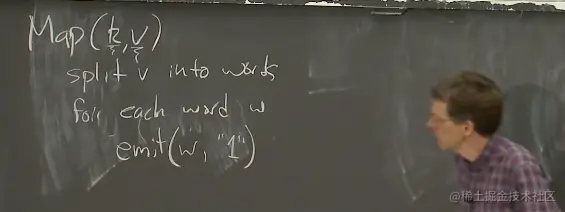 Map函数使用一个key和一个value作为参数。我们这里说的函数是由普通编程语言编写,例如C++,Java等,所以这里的函数任何人都可以写出来。入参中,key是输入文件的名字,通常会被忽略,因为我们不太关心文件名是什么,value是输入文件的内容。所以,对于一个单词计数器来说,value包含了要统计的文本,我们会将这个文本拆分成单词。之后对于每一个单词,我们都会调用emit。emit由MapReduce框架提供,并且这里的emit属于Map函数。emit会接收两个参数,其中一个是key,另一个是value。在单词计数器的例子中,emit入参的key是单词,value是字符串“1”。这就是一个Map函数。在一个单词计数器的MapReduce Job中,Map函数实际就可以这么简单。而这个Map函数不需要知道任何分布式相关的信息,不需要知道有多台计算机,不需要知道实际会通过网络来移动数据。这里非常直观。