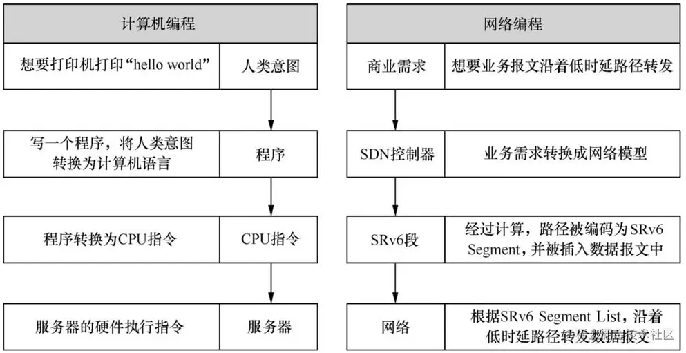 如果网络也能像计算机一样,将网络承载的业务的意图翻译成发给沿途网络设备的一系列转发指令,就可以实现网络编程,满足业务的定制化需求。计算机编程和网络编程的类比关系如图2-1所示。