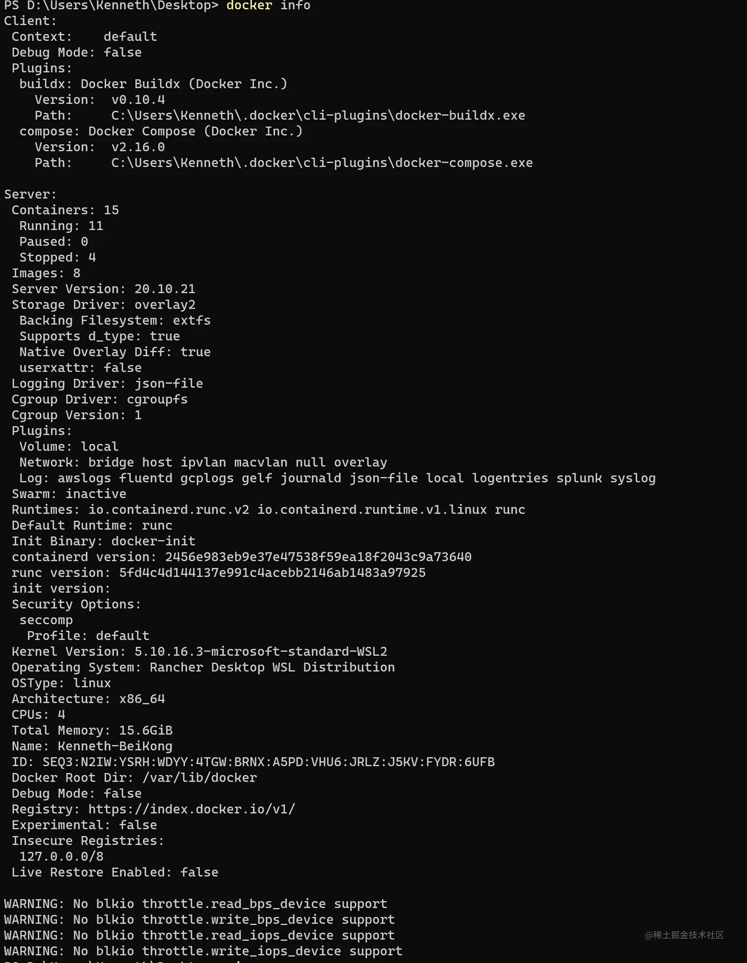 先安装好Rancher Desktop,启动之后使用 docker info 查看命令