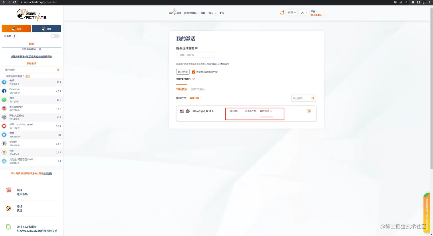 选择一个美国的临时号码链接购买,购买成功后在我的服务中可以看到,如图所示。