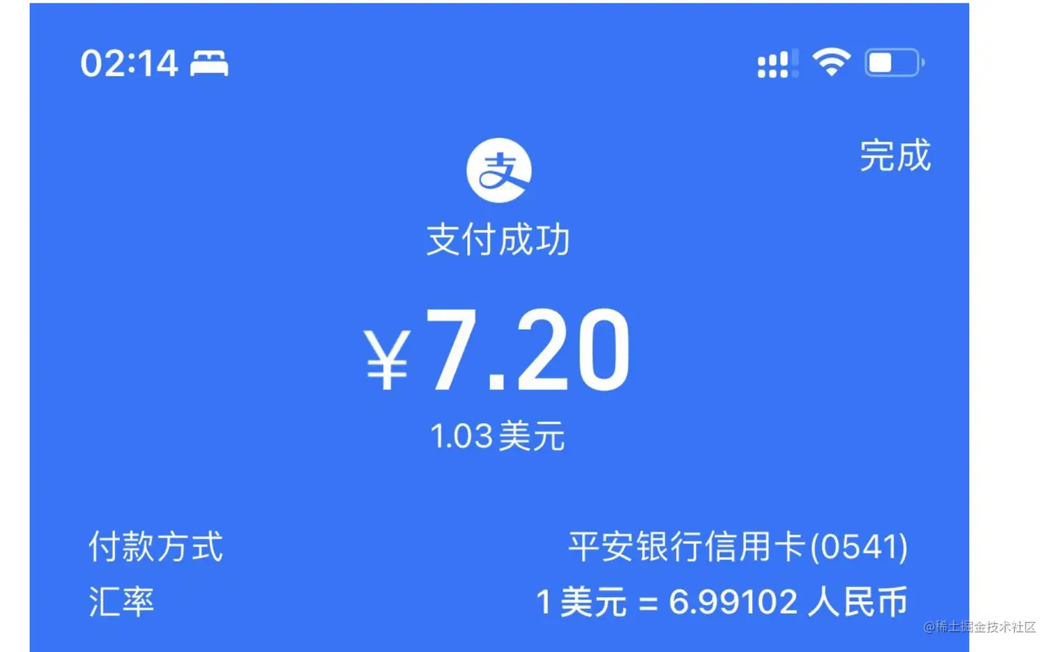 支付完成,汇率是 1美元 = 6.99102 人民币,如图所示。