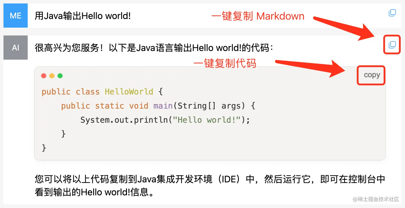 - 自己开发的工具, 增加一键复制功能, 是一件非常容易的事情. 这里支持代码块的一键复制, 也支持 ChatGPT 完整输出的 Markdown 复制.