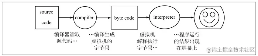 - 以Python为例,程序员写的源代码.py文件首先被编译成.pyc文件,称为字节码(Byte Code)
