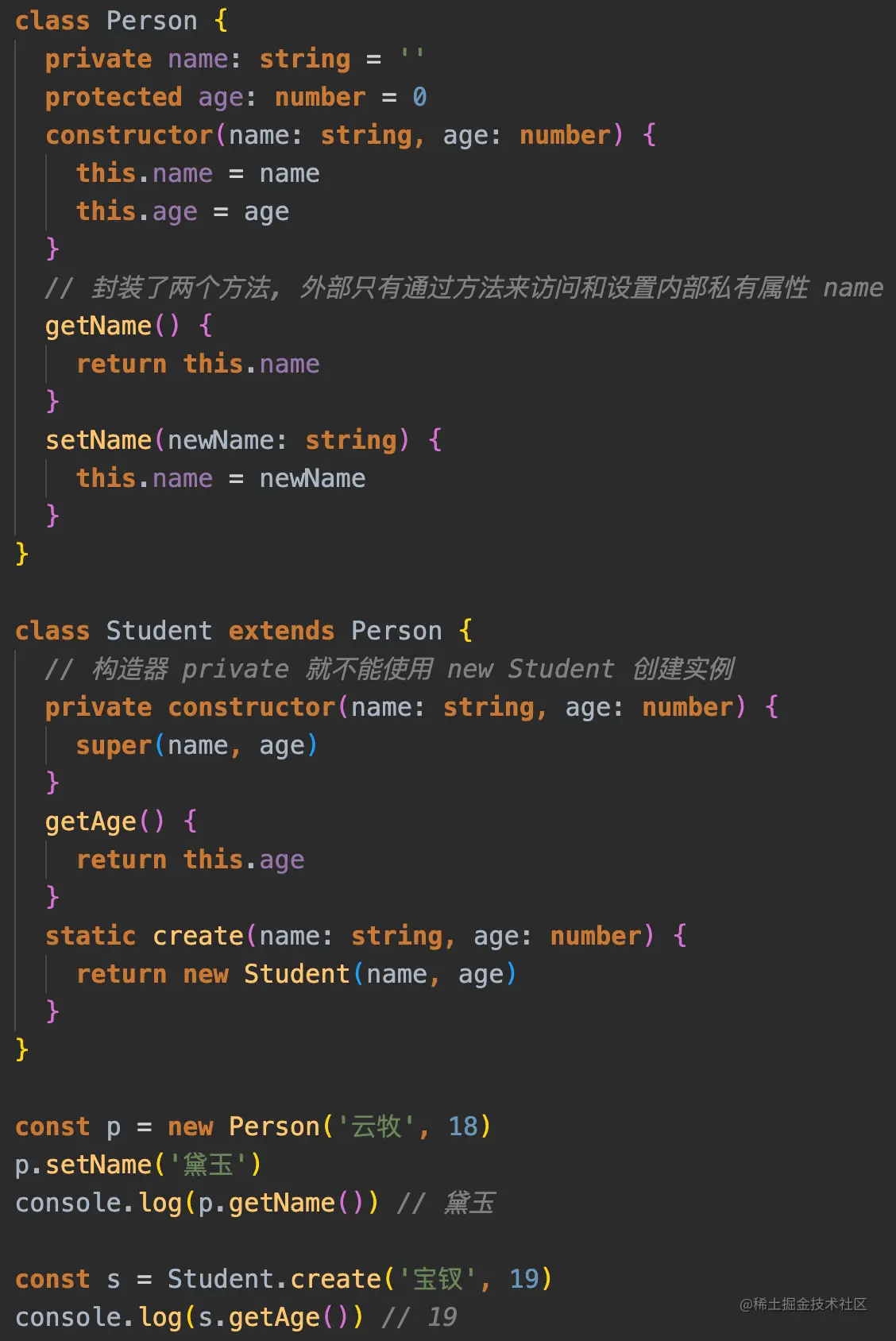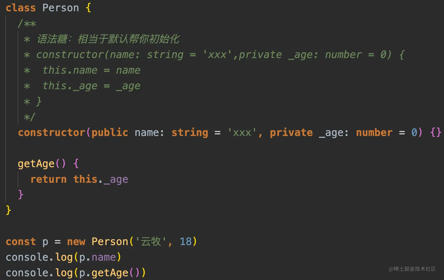 constructor参数转换为同名同值的实例属性,相当于帮我们做this.name = name的操作 - 我们可以在其