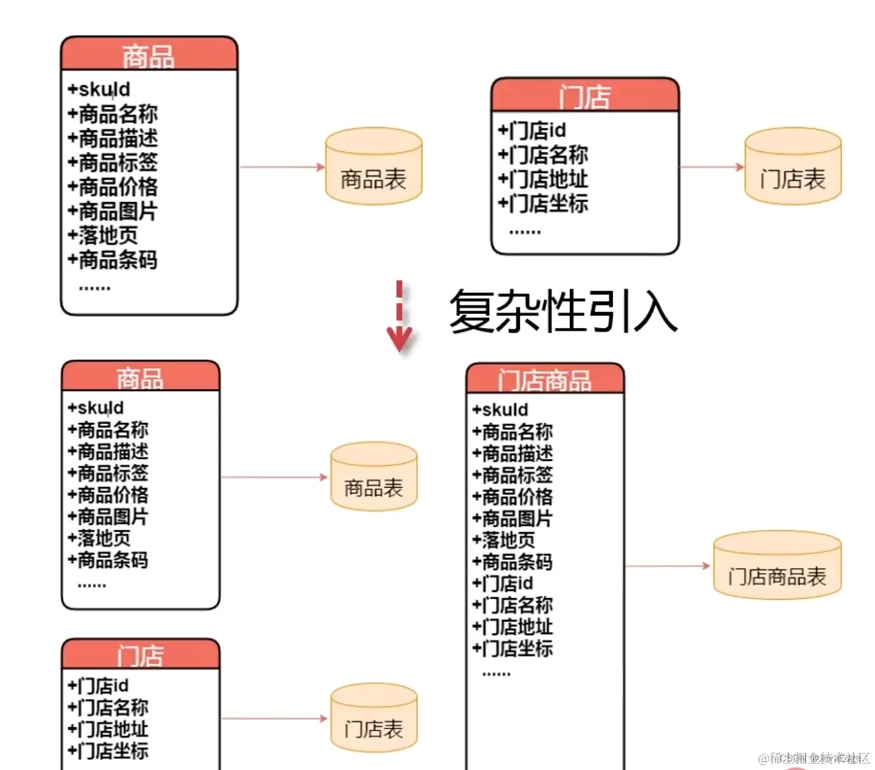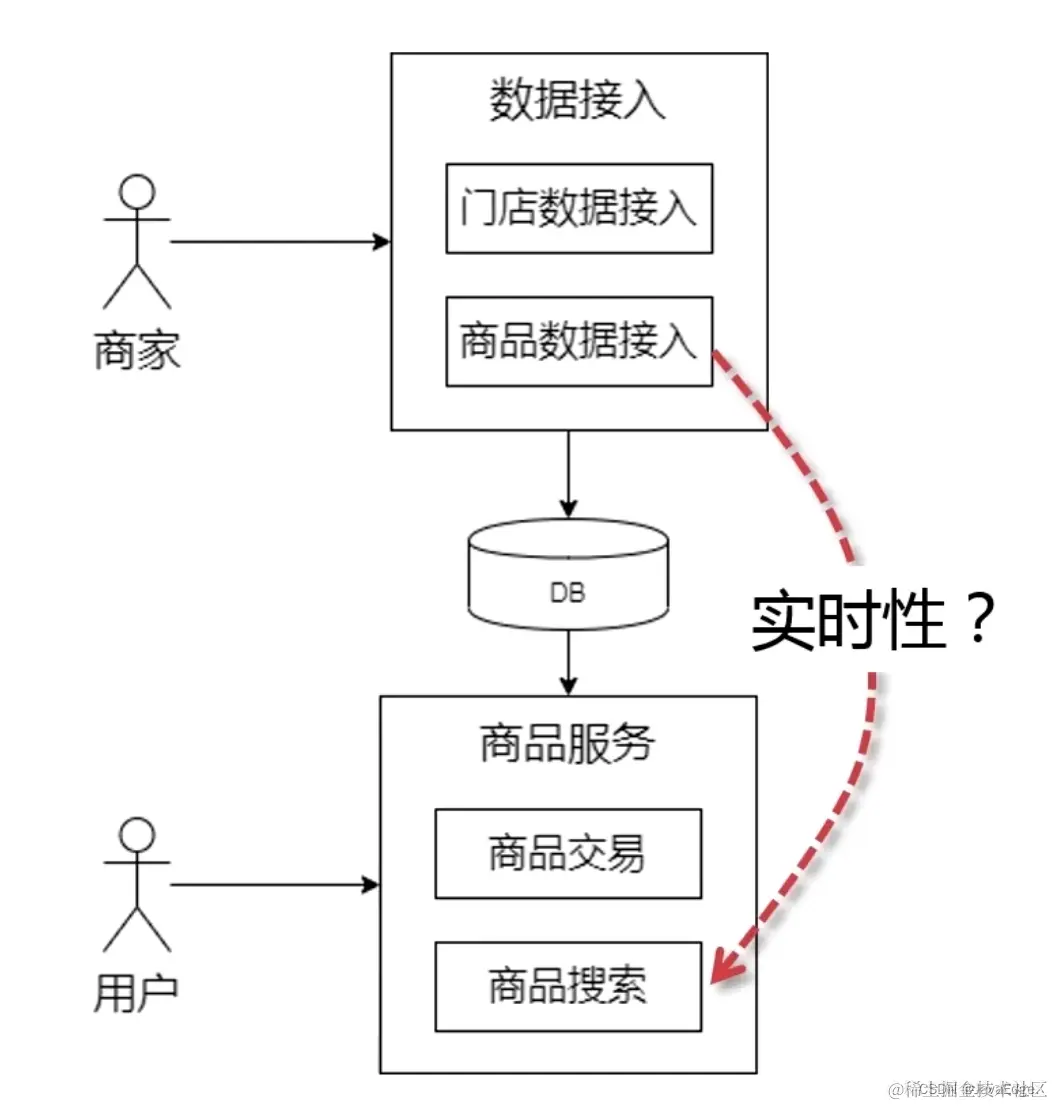 团队 A 负责数据接入,开发接口简单直接,商品和门店数据完全解耦。 团队 B 负责商品服务,开发商品搜索时,可能要支持对地理信息、门店的搜索,如优先搜索附近门店的商品,那就需要结合商品、门店的数据。 为提高搜索的实时性,AB 商讨在 A 构建数据时,为 B 的商品搜索服务再构建一份门店商品数据。