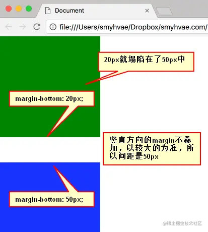 标准文档流中,竖直方向的margin不叠加,只取较大的值作为margin(水平方向的margin是可以叠加的,即水平方向没有塌陷现象)。