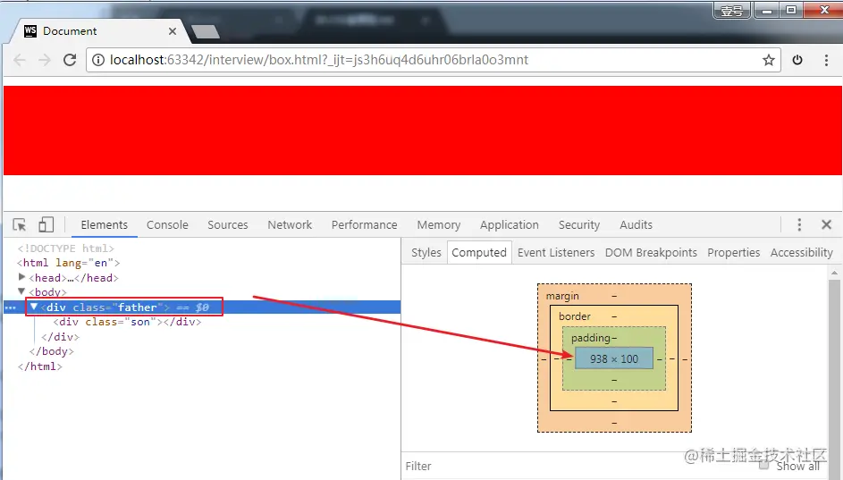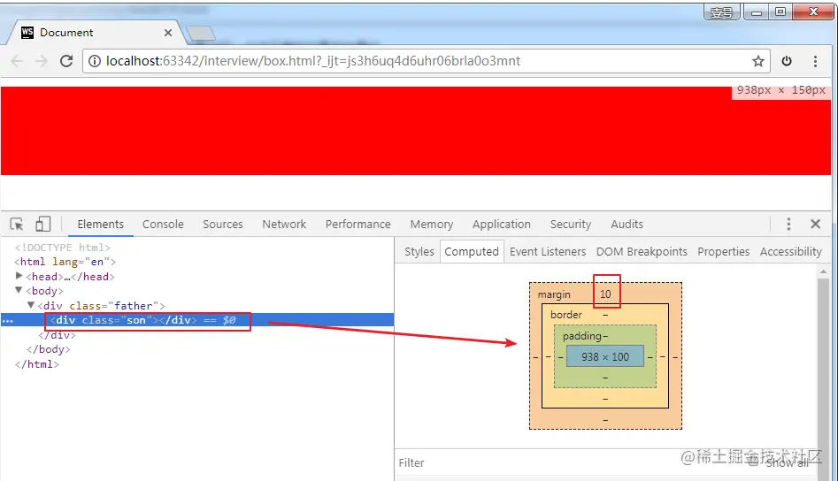 上面的代码中,儿子的height是 100px,magin-top 是10px。注意,此时父亲的 height 是100,而不是110。因为儿子和父亲在竖直方向上,共一个margin。