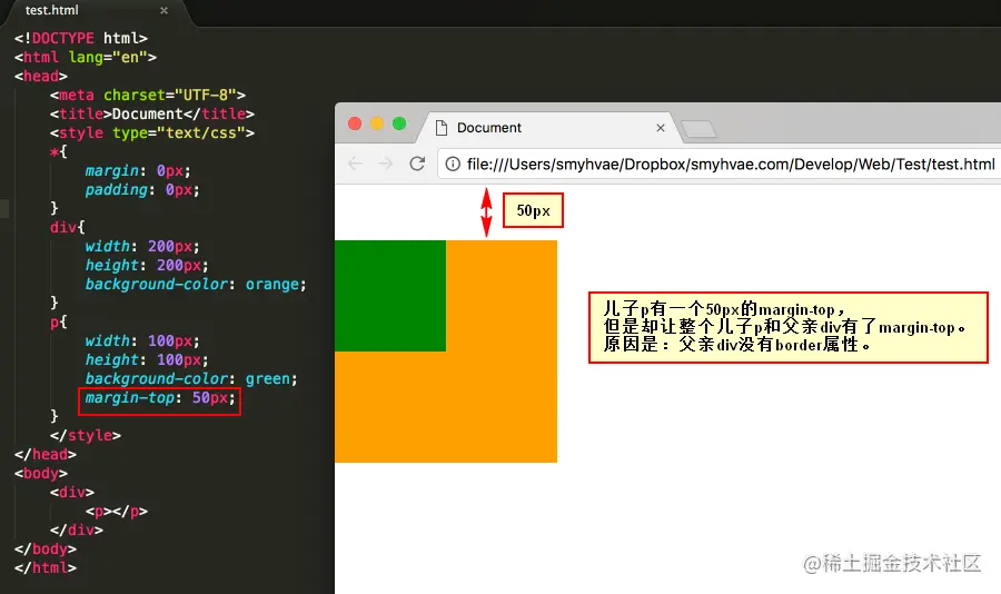 上面的结构中,我们尝试通过给儿子p一个margin-top:50px;的属性,让其与父亲保持50px的上边距。结果却看到了下面的奇怪的现象: