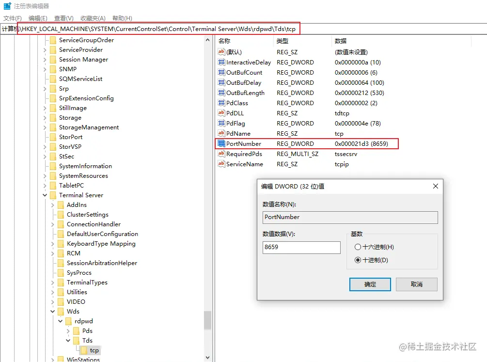 - 查找HKEY_LOCAL_MACHINE\SYSTEM\CurrentControlSet\Control\Terminal Server\Wds\rdpwd\Tds\tcp,然后修改PortNumber的子键值
