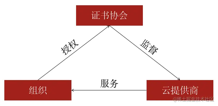 考虑到云数据治理需要与第三方交互,本文提出了问责机制来加强整体安全水平。它可以被定义为一种模型,可以向管理者和供应商提供交互式共享资源,如网络、存储、应用和服务。问责机制连接了三方,即组织、云提供商和证书协会(CA)。组织可以授权CA对云供应商采取监管行为 (如图1所示)。