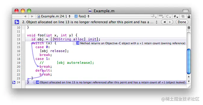 静态分析它能够帮助我们在编译期间自动查找错误,比起运行时的时候去找出错误要更早一步,可以用于分析 C、C++ 和 Objective-C 程序。编译器通过静态分析依据AST中节点与节点之间的关系,找出有问题的节点并抛出警告错误,达到修改提醒的目的。比如官方文档中介绍的内存泄露的静态分析的案例: