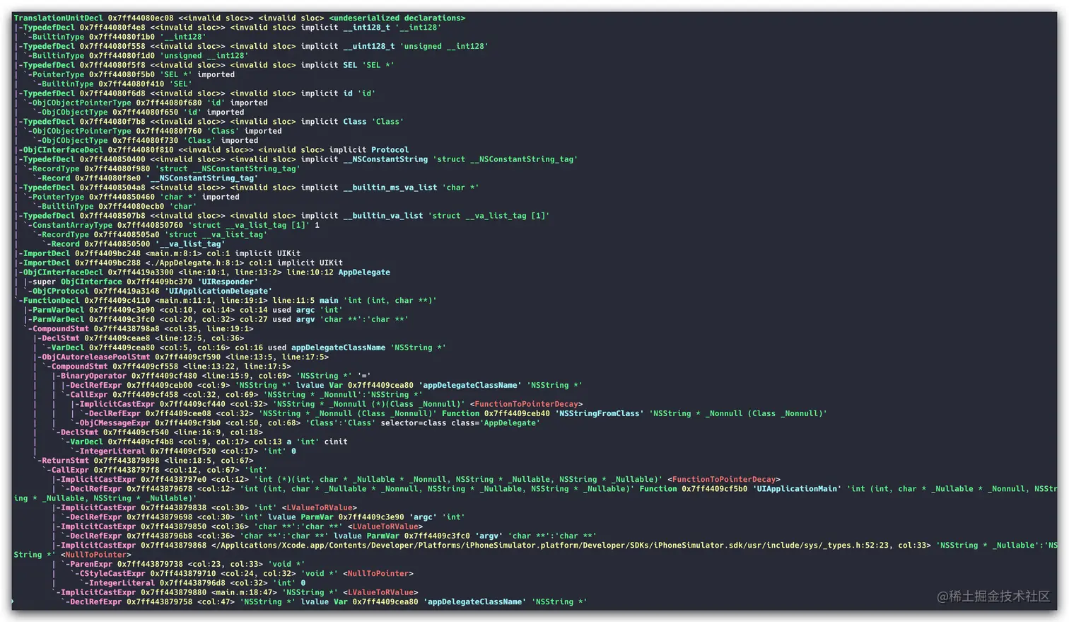 通过对原子token的组合解析,最终会生成了一个抽象语法树(AST),AST抽象语法树将源代码转换成树状的数据结构,它描述了源代码的内容含义以及内容结构,它的生成能够让计算机更好的理解和处理中间产物。以XCode生成的默认项目的main.m内容为例,在 clang 中我们依旧可以查看具体的抽象生成树(AST)的样子,可以对源码进行如下的编译: