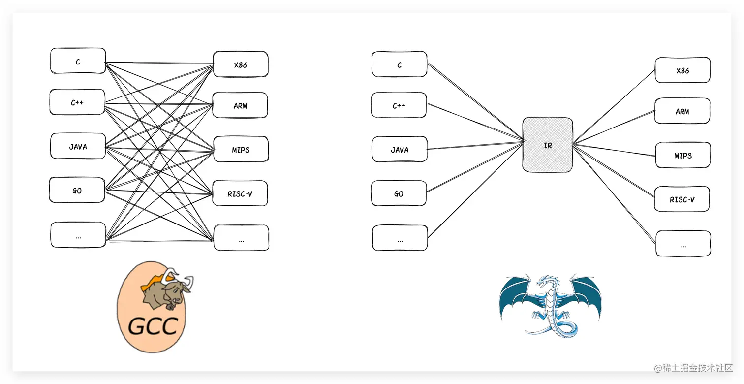 在经历过语法分析之后,编译器会对语法分析之后生成的抽象语法树(AST)再次进行处理,需要注意的是编译器并不会直接通过AST编译成目标代码,主要原因是因为编译器将编译过程拆分了前后端,而前后端的通信的媒介就是IR,没错就是之前提到过的LLVMIR这样一个中间产物。该中间产物与语言无关,同时与cpu的架构也无关,那么为什么要加上中间产物这个环节,直接生成目标代码难道不是更好吗?我们都知道cpu的不同架构直接影响cpu的指令集,不同的指令集对应不同的汇编指令,所以针对于不同的cpu架构要对应生成不同适配的汇编指令才能正常的运行到不同的cpu架构的机器上。如果将前后端的编译过程绑定死,那么就会导致每增加一个新的编译前端,同时增加对所有cpu架构的后端的支持(1对n的关系),同理,如果增加新的一个cpu架构支持,编译前端也需要通通再实现一遍,这个工作量是很重复以及繁琐的。所以为了避免这样的问题,Apple对编译器的前后端进行了拆分,用中间产物来进行前后端的逻辑适配。