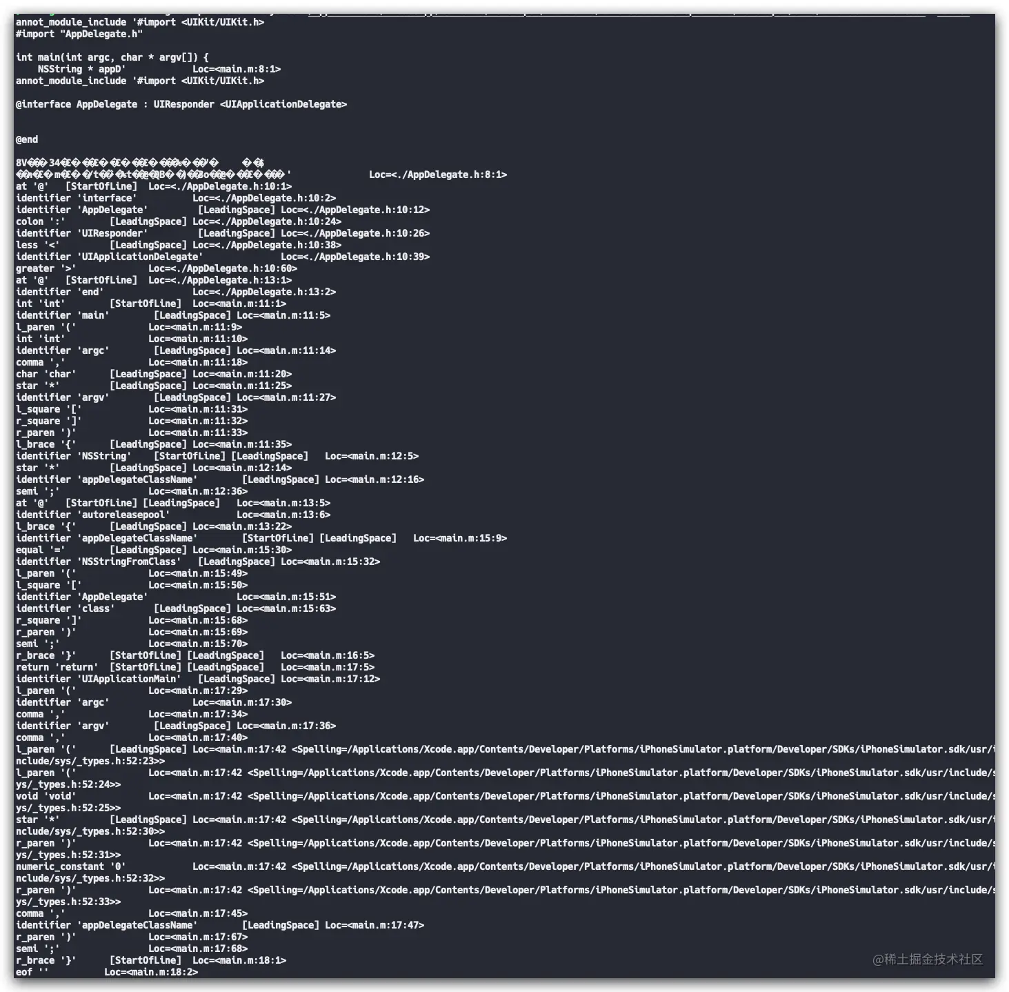 在词法分析完成之后会生成 token 产物,它是做什么的?这里不贴官方的解释了,简单点说就是对源代码的原子切分,切分成能够底层描述的单个原子,就是所谓的token,至于token长什么样子?可以通过 clang 的命令执行编译查看生成的原子内容: