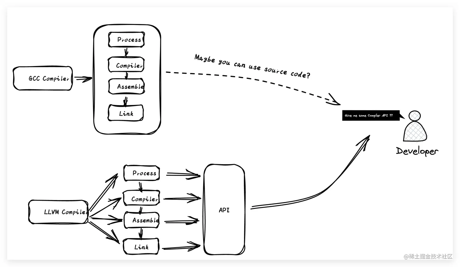 除了以上的问题之外,GCC整体的架构设计也是非模块化的,那什么是模块化呢?比如我们通常在系统设计的时候,会将各个系统的功能进行模块化分割设计,不同的模块能够单独为系统内部提供不同的功能。同时呢,我们还能把这些模块单独抽离出来提供给外部使用,这就增大了系统的底层的灵活度,简单说就是能够直接使用模块化的接口能力。