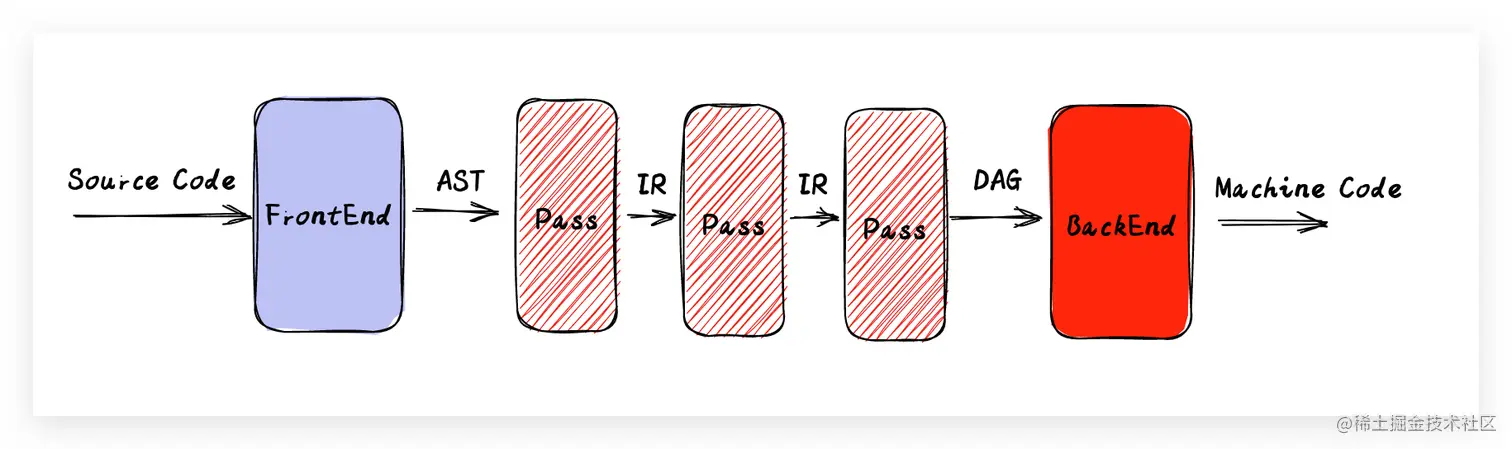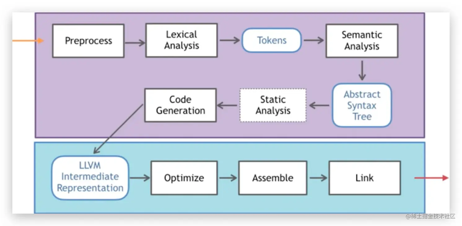 对于传统的编译器,主要分为前端、优化器和后端,引用一张通用的简洁的编译过程图,如下: