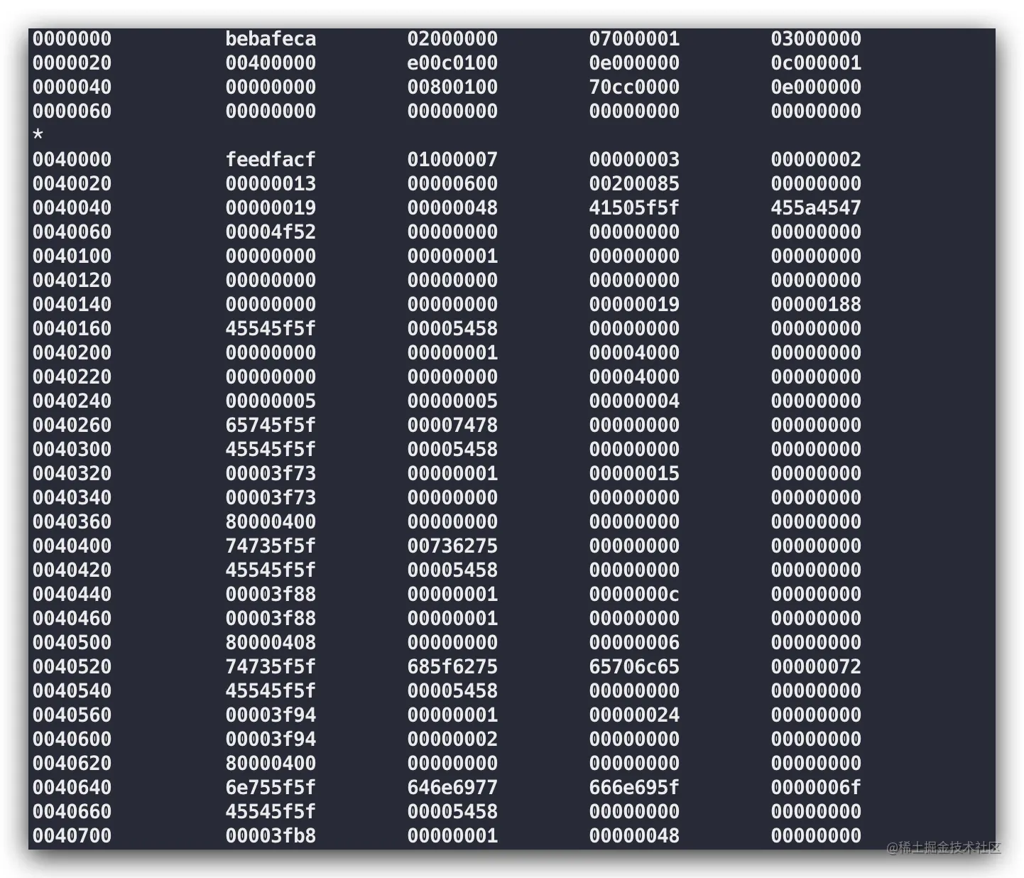 注:使用 od -tx1 /tmp/binary.bin 可以根据需要输出二进制、八进制或者十六进制的内容