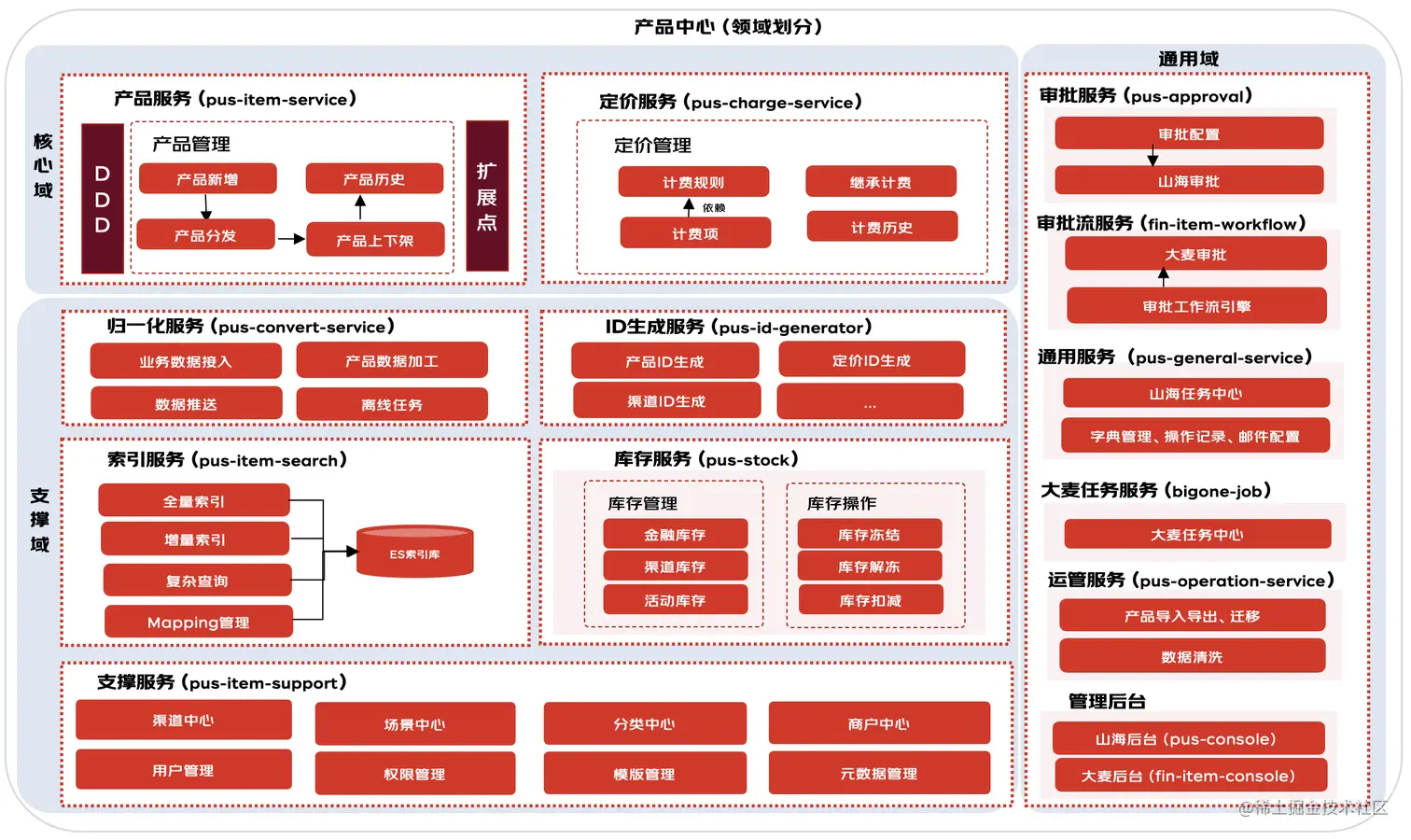 我们的系统基于DDD领域思想指导,划分系统业务边界,定义业务身份和扩展点,进行微服务设计。系统领域包括产品核心域、分类渠道支撑域以及任务和审批通用域。科技产品中心领域划分如下图所示。