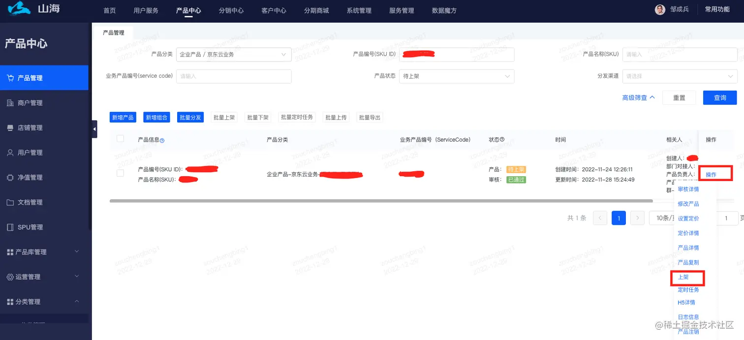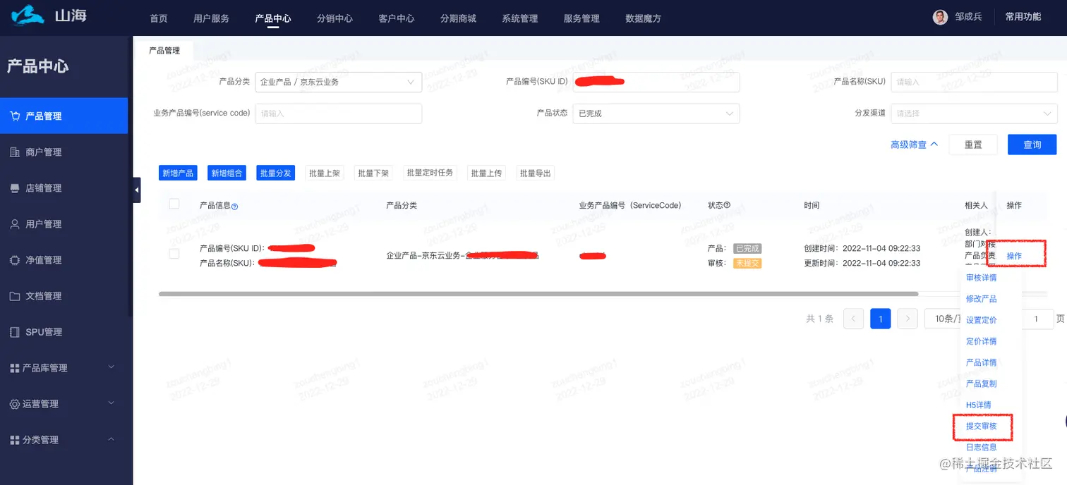产品已完成基本信息、定价信息的录入后,点击产品操作按钮,选择提交审核,系统会发起线上审核流程,审核通过后,可点击产品操作按钮,选择上架,确认后即可上架成功。