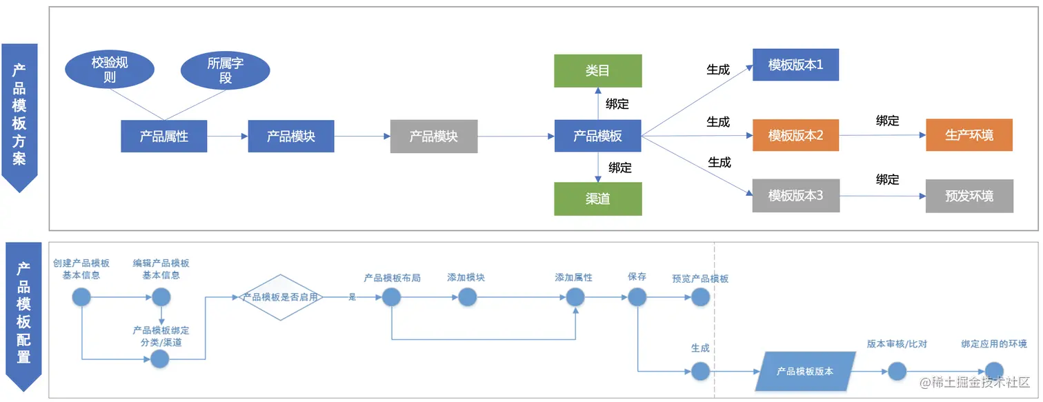 即可在指定环境发布产品模版,产品字段变更无需硬编码,通过可拖拽的模版画布,动态扩展产品表单。实现流程如下图所示。