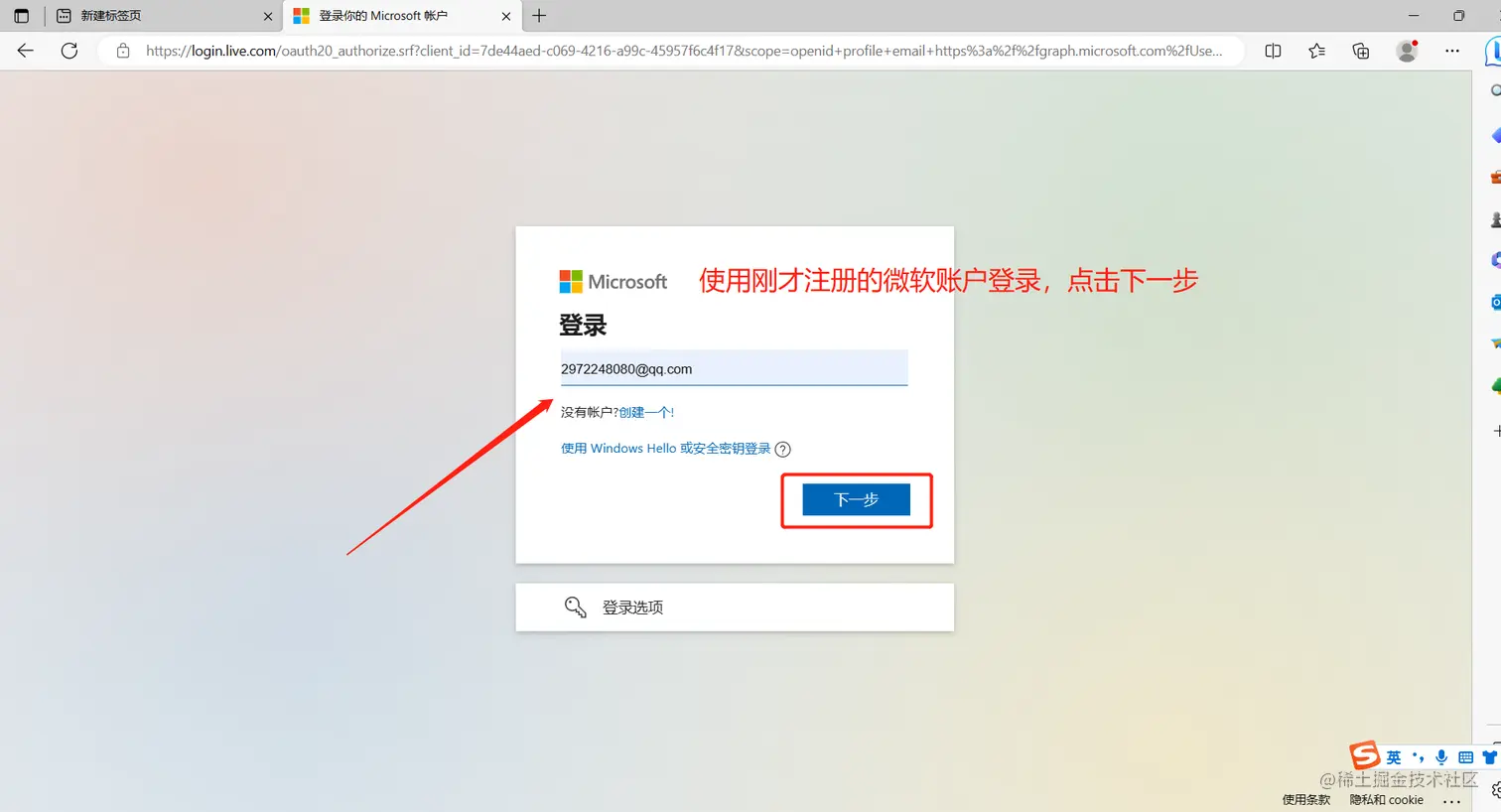 3、输入注册的微软账户进行登录