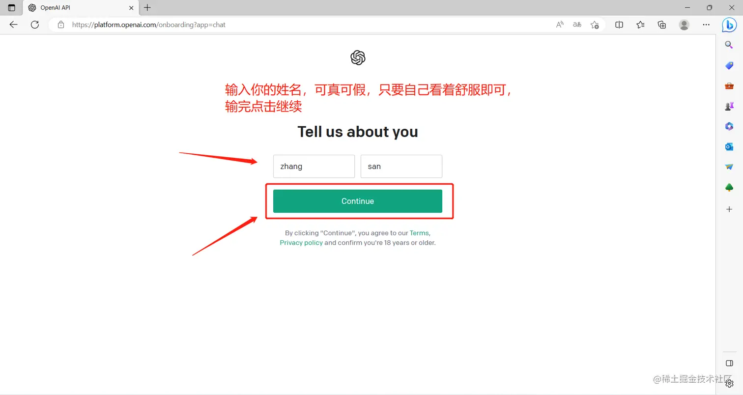 4、微软账户授权成功后会跳回OpenAI官网,输入自己的姓名