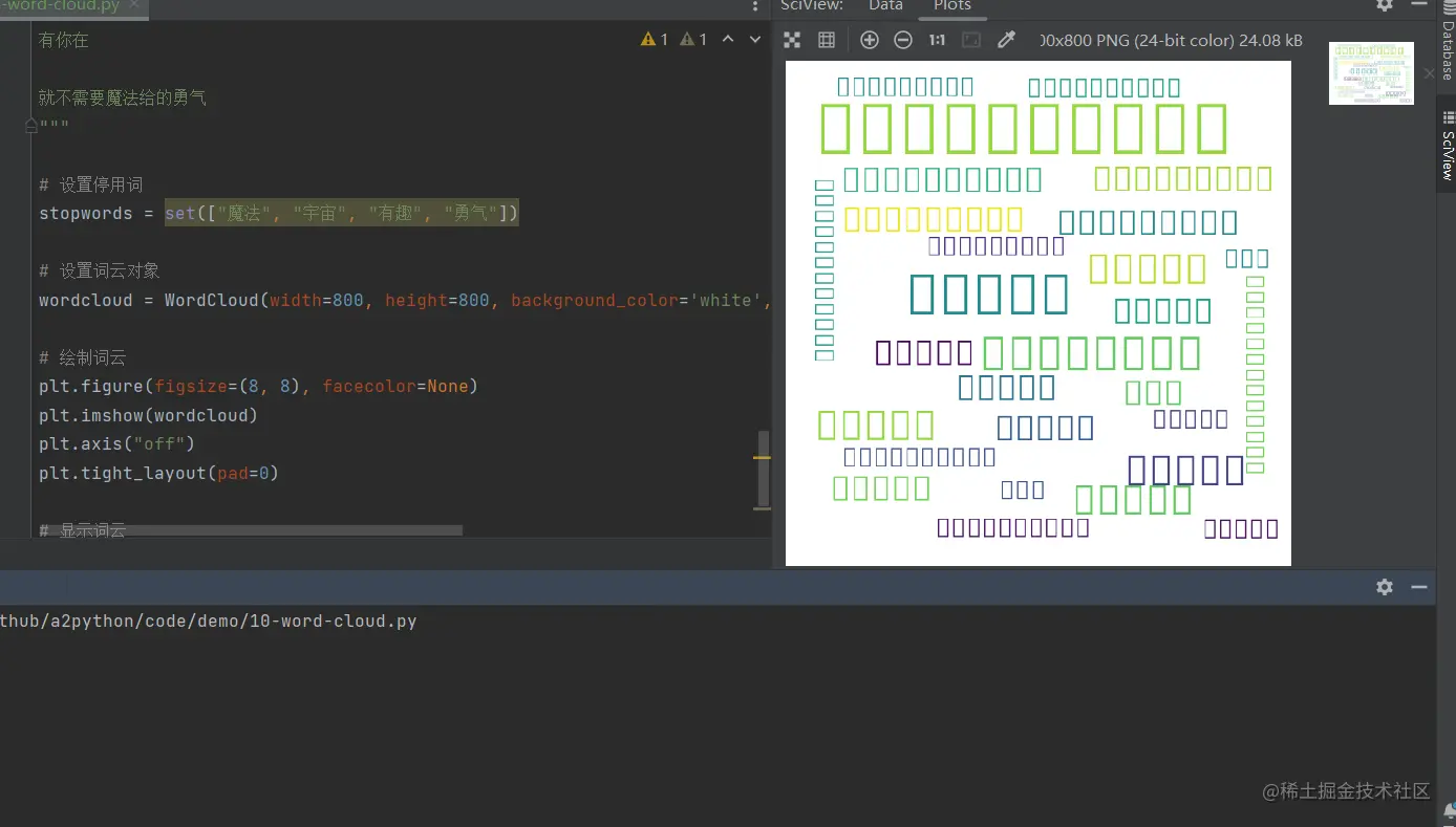 现在,我们可以使用wordcloud库来生成词云。以下是一个简单的代码示例,可以生成一个基本的词云