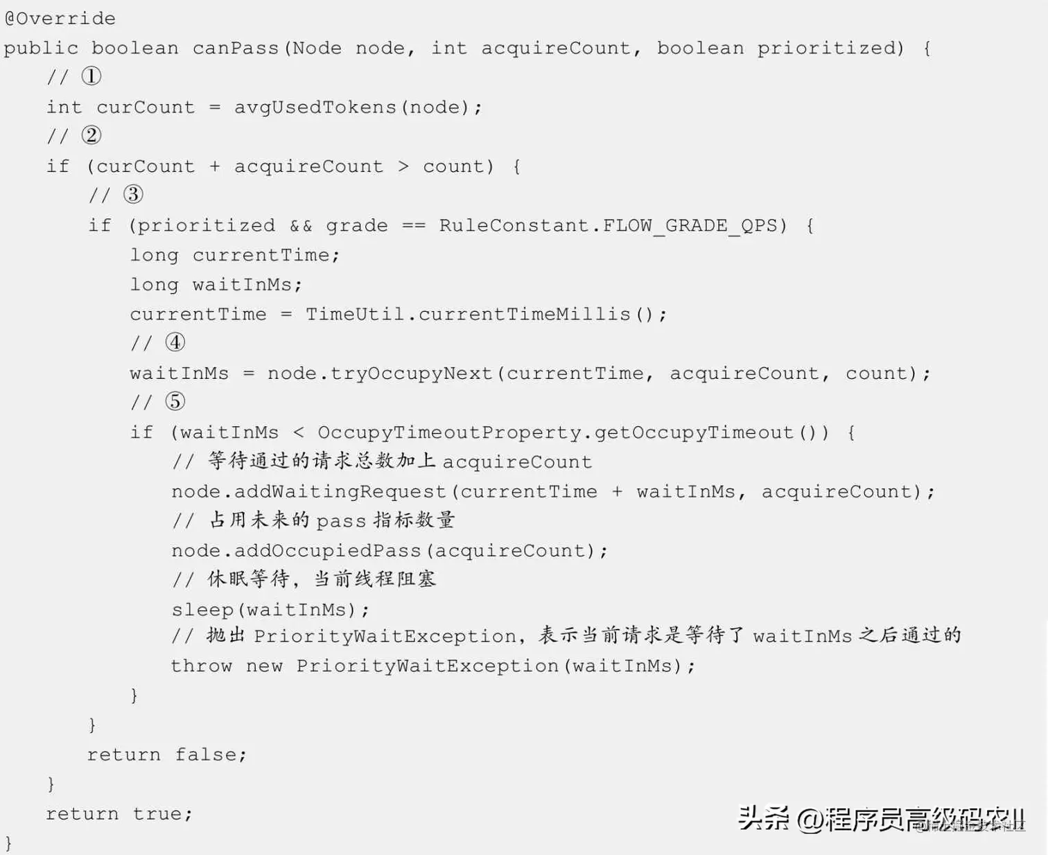 ⑤ 如果休眠时间在限制可占用的最大时间范围内,则挂起当前请求,令当前线程休眠waitInMs毫秒,在休眠结束后抛出PriorityWaitException,标志当前请求是等待了waitInMs毫秒之后通过的。在一般情况下,prioritized参数的值为false。如果prioritized在ProcessorSlotChain传递的过程中,排在FlowSlot之前的ProcessorSlot都没有修改过,则条件③不会被满足,因此这个canPass方法实现的流量效果就是直接拒绝。