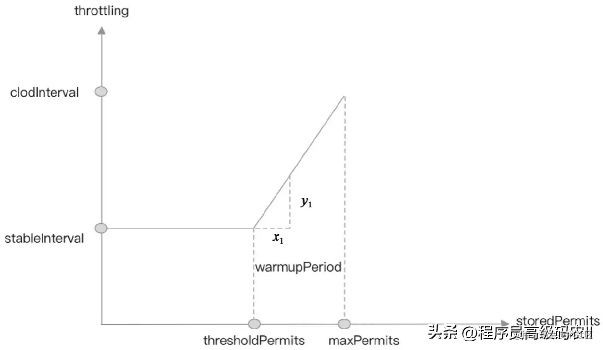 因为梯形的面积等于warmupPeriod,所以点stableInterval与点thresholdPermits所在的长方形面积是梯形面积的一半,即长方形面积为warmupPeriod/2。