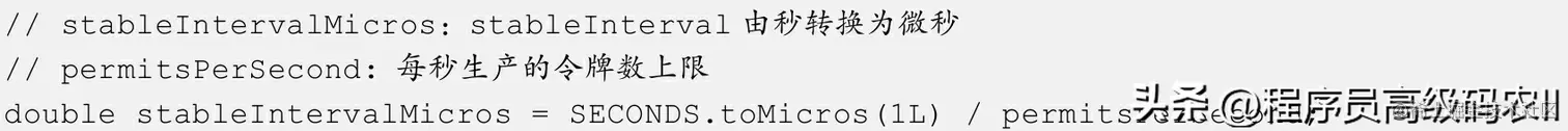 那么,用1秒(转换为微秒)除以每秒需要生产的令牌数,计算出生产令牌的时间间隔(stableInterval)为5000μs,对应SmoothRateLimiter的源码如下。