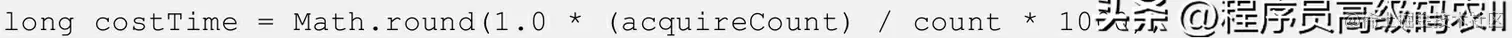 假设count=1200(限流QPS阈值),当acquireCount=1时,costTime=1000/1200,这个结果是小于1毫秒的,使用Math.round方法取整后值为1;而当QPS阈值增大,costTime的计算结果小于0.5时,使用Math.round方法取整后值就变为0。